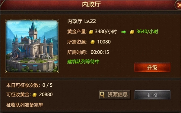 1、内政厅的等级决定了其他建筑的上限,所以领主们在升级后的第一件事应该就是升级该建筑。在内政厅中,领主可以定时征收黄金,一天可以征收5次,数量相当可观。