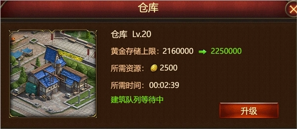 4、在仓库中,升级等级可以提高黄金储量上限。游戏中随着等级的提高,黄金的产量也会越来越多。尽早提升仓库等级可以避免资源的浪费。