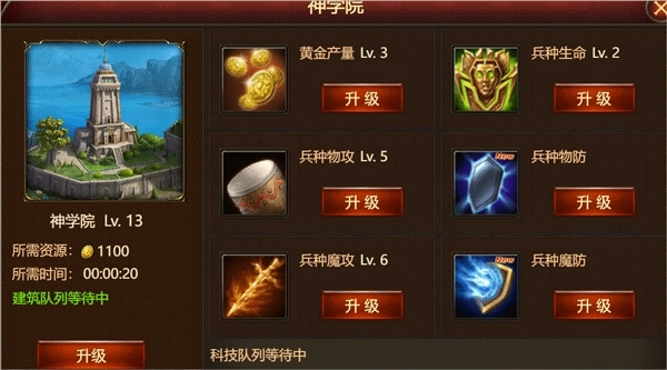5、在到达21级后,领主们就可以解锁神学院了。在神学院中可以升级大量的科技,例如黄金产量,领主攻防,士兵攻防等。同样随着建筑等级的提高,这些科技的上限也会提高。