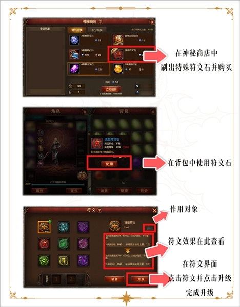 符文升级方式:点击技能-点击符文-找到需要升级的符文-点击升级。升级所需的通用符文石可以在地下迷宫、王者之塔、游戏盒子、活跃度宝箱中获得;