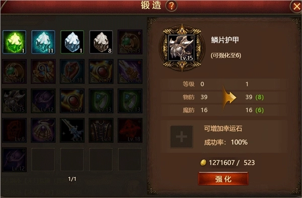 2、放入装备后就可以开始一键强化了。需要注意的是随着强化等级的提高,装备强化成功率会下降。这时就有了幸运石的用武之地,放入幸运石可以显著提升强化成功率。