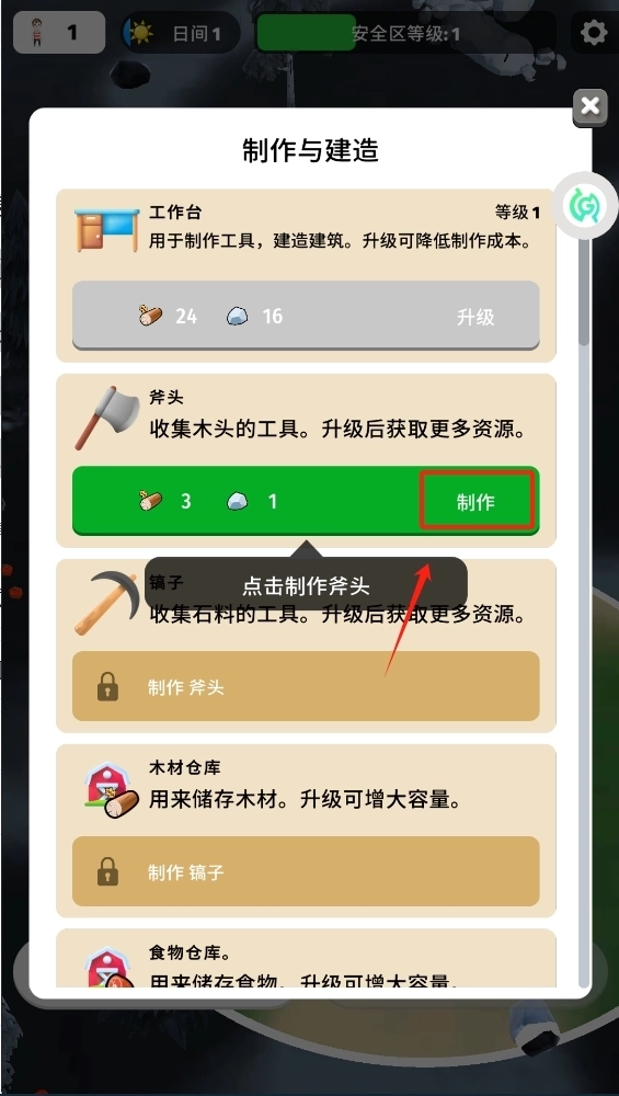 3、在制作界面选择材料,点击制作获取斧头等工具,提高效率。