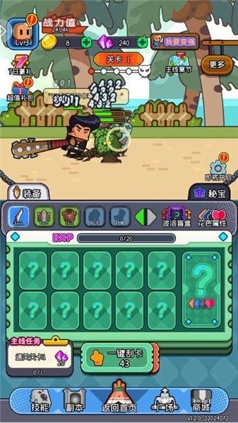 《天天闯关》游戏作为一款放置,装备的核心获取是通过刮刮乐获得,而装备本身的属性则是通过刮刮乐中奖属性来随机决定的,这大大的区别于市面上同类产品,玩家在游戏中可以通过极品、神品的装备属性,来逆天改命,快速通关!