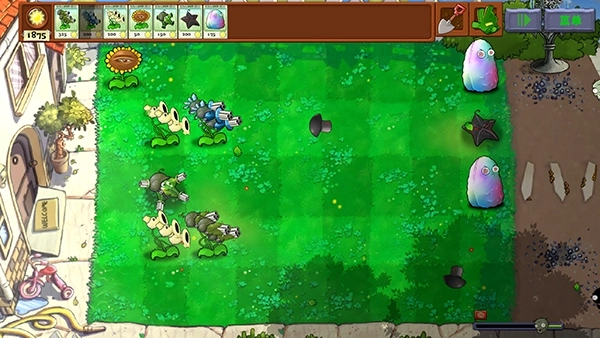 若遇到开阔场地地形,优先在场地边缘种植范围攻击植物,像发射毁灭菇的杨桃,能有效打击从多个方向涌入的僵尸。在场地内部,可分散种植一些防御植物和辅助植物,如魅惑坚果墙,可放置在僵尸可能经过的关键路径上,让僵尸咬后倒戈,打乱敌方进攻节奏。