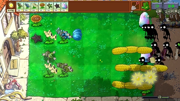 2、第一关即可使用全新强化植物,如爆裂杨桃、暴力三连豌豆、玉米炮组合等。
