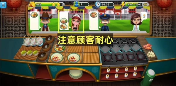 3.茶水与蒸饺均为自动制作,蒸饺每次给顾客送完后即可点击制作,不会出现做多的情况,请放心。另外,菜品递送给顾客时会让其耐心值稍有恢复,因此茶水和蒸饺可以稍微晚一点递送,这样能增加顾客的耐心。