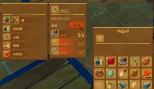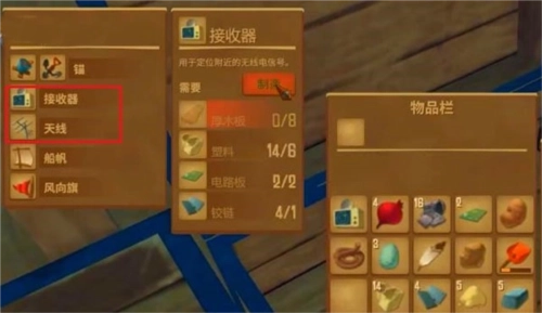 岛屿探测器指的是接收器,制作接收器的材料是厚木板、塑料、电路板和铰链,玩家制作出接收器后,还需要制作天线,制作完成后,将其放置在木筏上,最后给接收器安装电池就可以使用接收器。