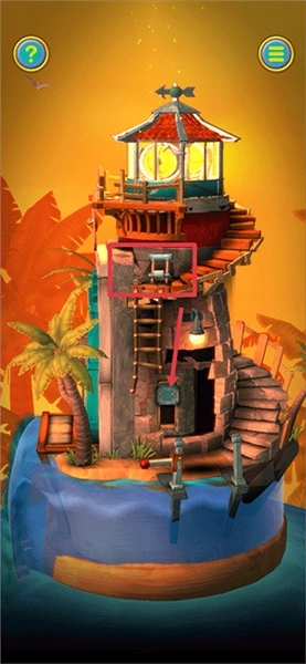 2、触发第二段教程后,先返回缩小视角,把灯塔转动到下图所示的角度,上方的盒子能滑动打开获取【红宝石】,下方可以拿到【船轮】和【蓝宝石】