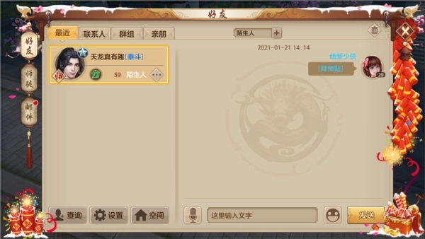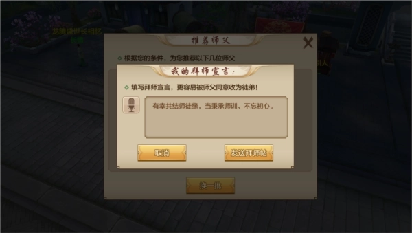 找到自己“心仪”的师父以后,就可以开始拜师啦。按照江湖规矩,拜师时需要少侠准备“拜师帖”一份,写好拜师宣言后,拜师帖就会通过聊天发送给师父。