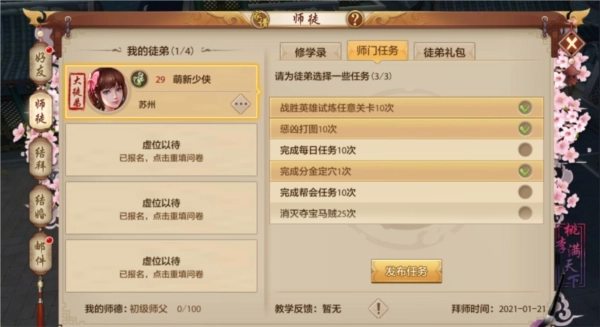 少侠作为普通徒弟拜入师门后,可以从修学录中完成相应任务,并获取丰厚的奖励,修学录任务为一次性任务。此外,身为师父的少侠每天都可以为徒弟派发师门任务,徒弟通过完成师门任务,也能加快升级的进度,同时,师父也可以获得桃李值作为奖励。
