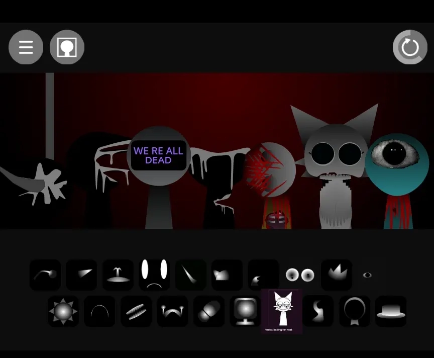 3、sprunki模组的亮点是恐怖模式,现在我们将最后一顶黑帽子拖拽到角色身上。