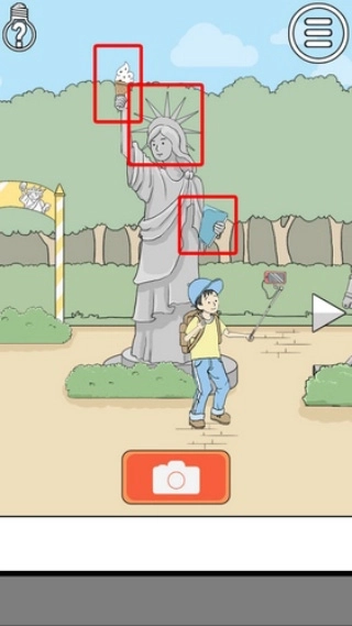 10、检查主角的书包,从里面取出书本(圣经);接着向右切换场景,在妈妈身后的车轮上取下花纹(皇冠),再从女儿手中拿到冰淇淋(火炬)。把书本(圣经)、冰淇淋(火炬)和花纹(皇冠)依次放置到雕像(自由女神像)上,最后点击按钮拍照,就能成功通关啦!