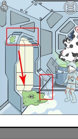 30、向右切换场景后拾取照相机,把它交给主角。主角拍照时的闪光会晃晕四眼怪物,这样我们就能安全拿到梯子上的电线了。接着向左切换场景,点击变大装置让奶牛变大一圈,再点击奶牛,它的牛奶会融化地上的绿色液体。之后装上电线,再次用变大装置把奶牛放大一圈,点击奶牛,牛奶会击落怪物,怪物随之触电死亡。最后取下电线,点击左侧的门,就能顺利通关!