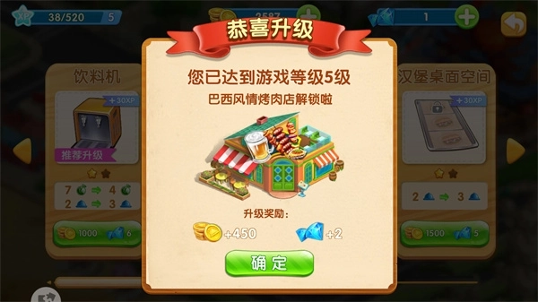 1、游戏等级需达标要解锁到梦想蛋糕屋的巴西风情烤肉店,需要在第一大关的美式快餐车里不断冲关成功,并且游戏等级要升级到五级。然而这并不意味着你可以直接开始玩巴西烤肉店,还需要消耗5000金币和20个钻石,才能正式解锁。我们都知道金币获得并不难,玩多几关就能获得金币收益,难得是钻石的获取。你需要每天登录签到获取免费钻石,当然也可以直接购买