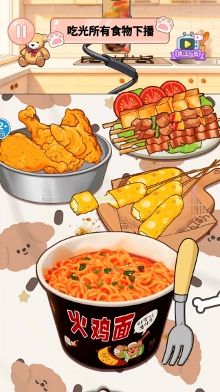 1、打开游戏,开启美食直播,必须把所有食物都吃完才能结束直播。