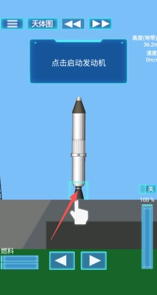 3、按顺序点击启动发动机按钮与总开关按钮,就能顺利把火箭发射到空中。