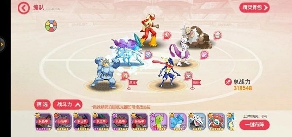 这套阵容在精灵选择上侧重于输出能力与攻击速度的搭配。具体的位置安排如下:前排部署火烈鸟、水箭龟和请假王;后排则配置甲贺忍蛙、螳螂以及水君。
