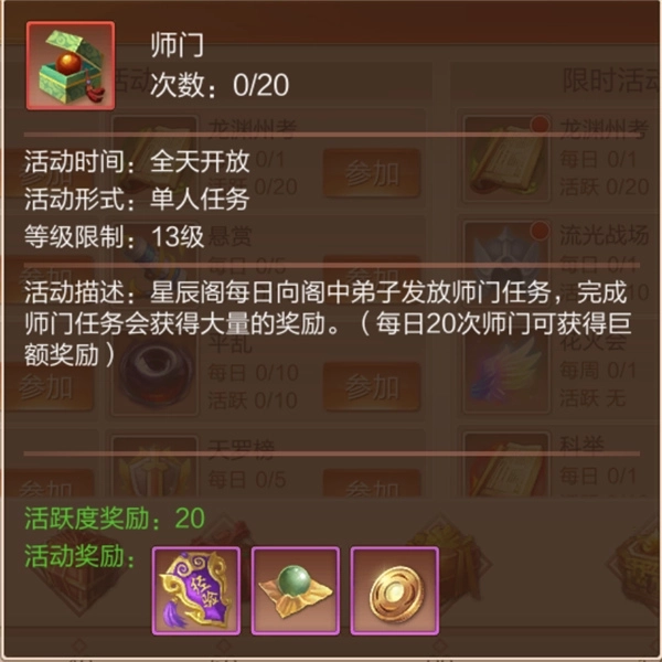 首选必做的就是每天的师门任务了!每天的前20个师门任务可以提供巨额经验!