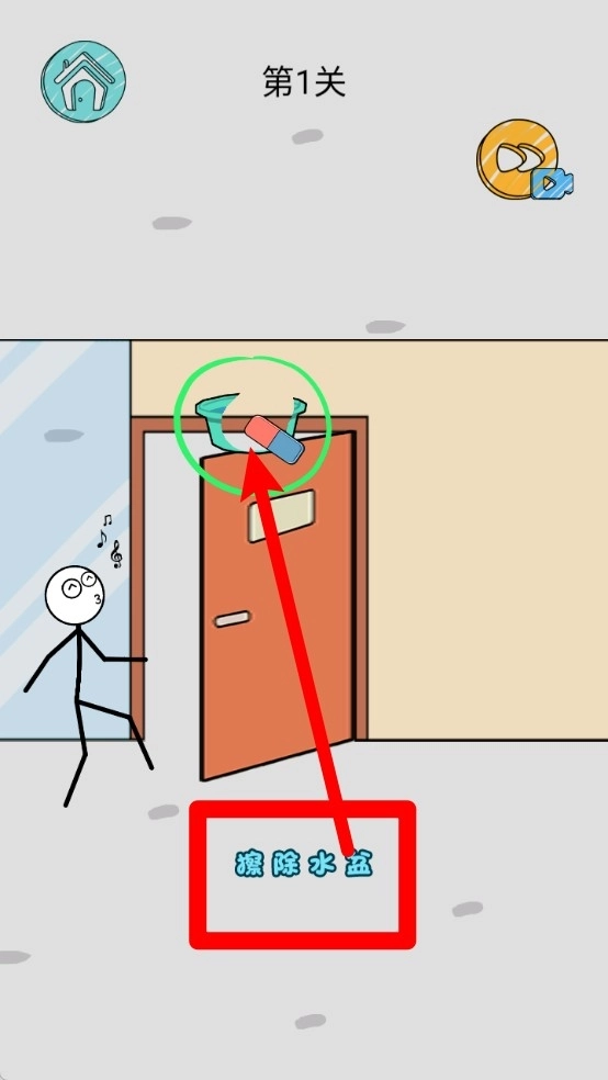 1.点击“擦除水盆”按钮可直接移除陷阱装置,让火柴人安心进门,不被水盆意外砸中导致闯关失败。