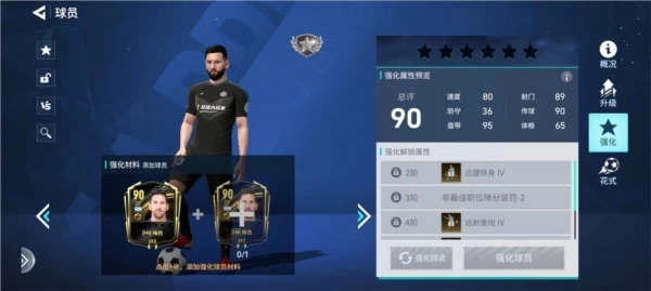 添加球员材料可进行球员强化,球员总评数值+1,在强化属性预览可查看强化效果。