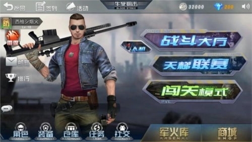 主界面最引人注目的区域是玩家当前操控的游戏角色,它占据了画面的核心位置;角色右侧则排列着战斗相关的功能选项,如战斗大厅、天梯联赛、闯关模式等。游戏的各类系统功能分布在界面的左侧和下方区域:左上角设有签到入口与公告栏;左侧及左下角集中了玩家的个人信息、背包仓库和交互系统,玩家可在此查看个人数据、整理装备、添加好友或收发邮件;右下角则是军火库与商城这类消费功能的入口。整体来看,界面布局层次清晰、规整有序,玩家能快速找到所需功能。