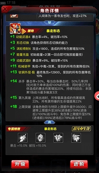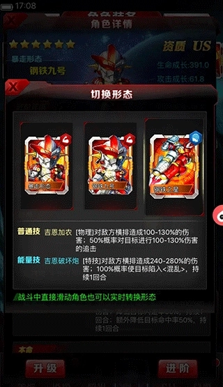 2、游戏的前中期阶段,要是你既想打出伤害,又没有US爆钢这个角色,那么可以先使用基础的钢铁九号形态。它的普通技能只要运气不错,还是能触发控制效果的。等后续资源积累得比较多了,就可以把钢铁九号转换成US爆钢形态(这个进阶到+15的阶段需要九只对应角色,所需水晶是SS级别的六倍,金币则是SS级别的三倍),转换后同样可以用来打伤害。这里还有个值得注意的点:爆钢的能量技能能够降低对方横排角色50%的命中和闪避属性,而且这个效果会持续一个回合,所以爆钢也可以用来辅助闪避流的角色,比如银河斯特利姆和海帕。