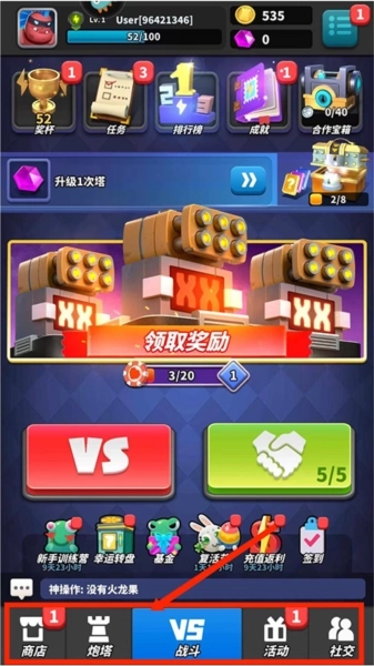 1、启动僵尸风暴手机应用,进入游戏主界面后,可看到界面分为【商店】、【炮塔】、【战斗】、【活动】与【社交】这几个栏目。