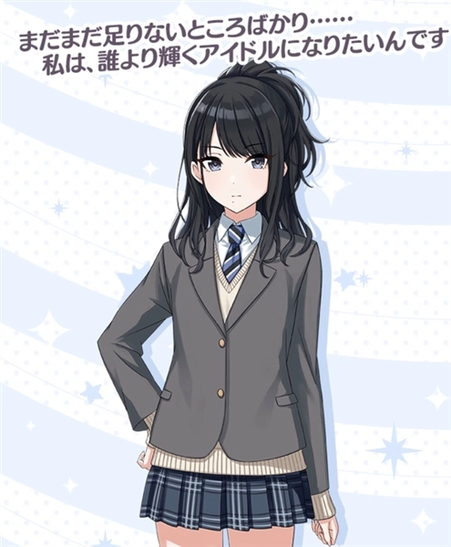 缠绕在后面的黑发给人留下深刻的印象,是一名cool系的美少女。拥有一直努力到自己满意为止方才罢休的克己性格。高中一年级。