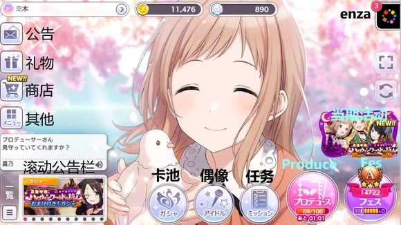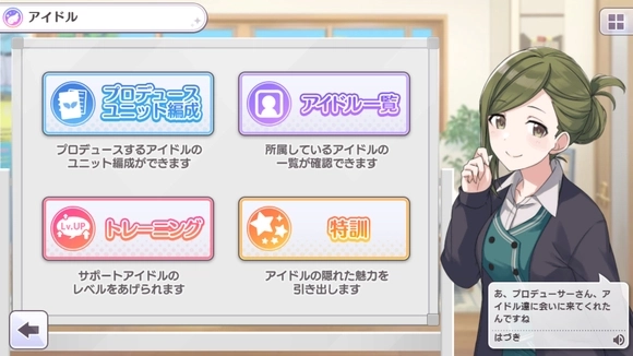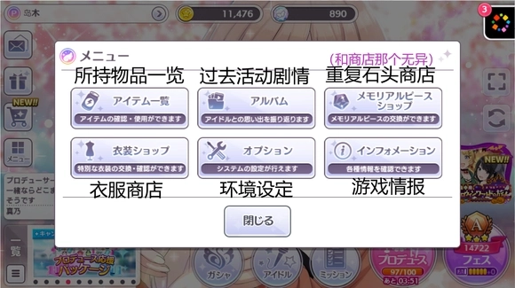 偶像:左上到右下分别为:编成,一览,强化,特训