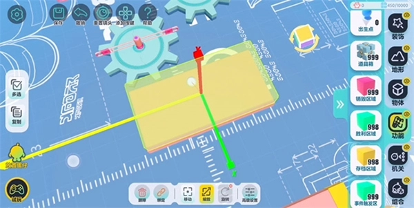 为方便操作,在正式开始搭建前,需将设置中的编辑视角更改为【上帝视角】。在机关中找到“齿轮”并拖出,即可实现“齿轮”摆放的基础操作。除了正常的摆放外,还可以点击【旋转】将“齿轮”旋转至竖起,也可以调整【缩放】调整“齿轮”大小及侧面的宽度。待尺寸设置完毕后,点击左侧【复制】按钮,即可批量复制已调整好的组件,达到节省时间、提高效率的效果。