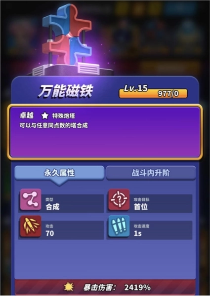 万能磁铁(它可以与同点数任意球球进行合成,他的出现是为了让克隆炮塔与仿生蛇炮塔最大限度的利用起来,蛇一个万能一个,这样可以利用最大化。)tip:如果您有魔镜,可以将万能磁铁更换为魔镜。