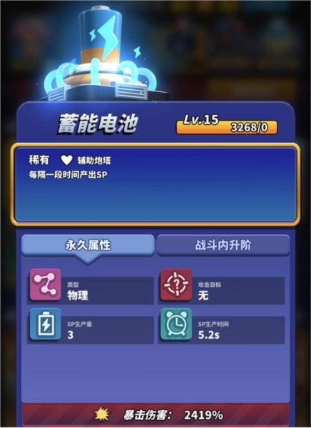蓄能电池(蓄能电池可以保留3级以上的,这样利用最大化,没有空位了,可以将2~1级蓄能电池合成进行容错买炮塔出蛇,进行给输出方加强炮塔。)