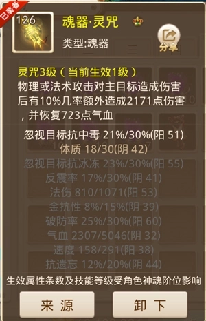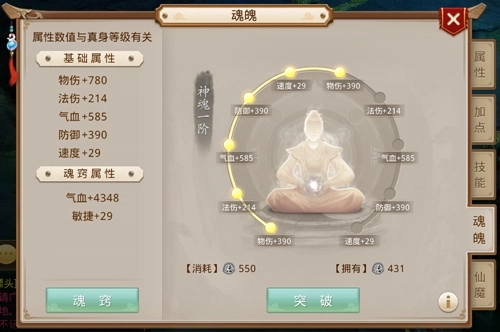神魂系统存在阶位划分,每个阶位包含十层,当十层全部突破后即可实现阶位的晋升。其一,神魂突破的前提是消耗阴德,而阴德的获取途径为地宫探险;其二,神魂阶位的每一层都会带来属性加成,不过这些加成属性仅在地府场景中发挥作用;其三,神魂每提升一个阶位,魂器能够生效的属性就会增加一条,同时可生效的技能等级也会提升1级。举例而言,若当前神魂处于一阶状态,那么对应的魂器仅有第一条属性处于生效状态;即便魂器本身的技能等级达到3级,此时实际可生效的等级也仅为1级。