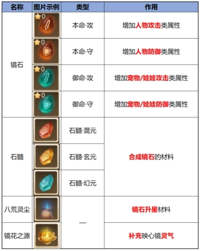 b.参与八荒相关玩法(例如八荒秘宝、仙使事件等)时,有一定概率获取各类石髓,将其合成为镜石后,可镶嵌到映心镜上,为角色、宠物和娃娃提升战斗属性(此属性在所有场景下均会生效)。