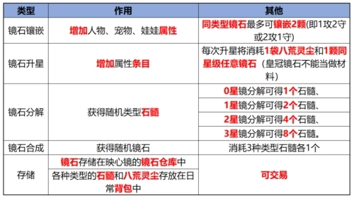 a.主要分为镜石的镶嵌、升星、分解、合成、存储。