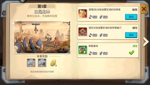1、启动《猿族时代》游戏,完成基地修缮后,第一章的内容便到此告一段落了。