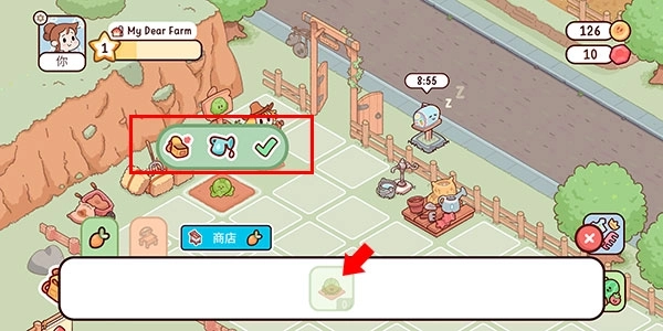 2、拖动至方格上并点击后方的勾号即可完成种植,上方功能从左到右分别是收纳至背包,浇水、确定种植