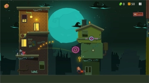玩家基本只用一根手指就能操控,这里没有上下左右的方向键,也没有跳跃键。拖动主角时会出现抛物线,紧接着你会进入“子弹时间”,周围的动态会变得非常缓慢,松开手后,主角就会沿着抛物线的轨迹弹射出去,并且能粘在任何地方。
