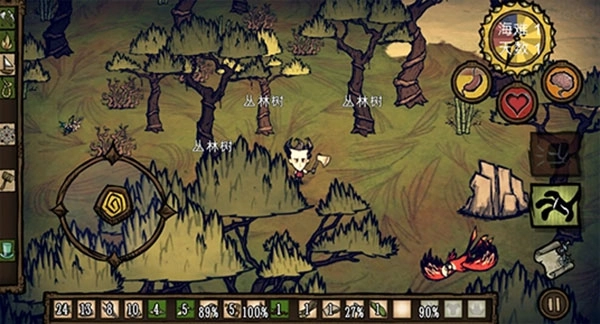 注意:在丛林地形中砍伐各类植物,或是在黄昏之后,都有可能生成蛇,尤其是黄蛇带有毒性;椰子掉落时若砸到头部会造成20点伤害。