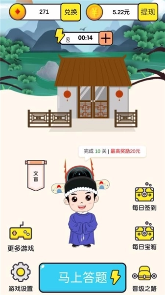 成语小状元,这是一款兼具趣味性与知识性的猜成语手机游戏!别出心裁的游戏关卡既考验玩家的成语积累,又创新加入养成元素,让你在探索中收获满满的成就感。通过持续答题闯关,你能从初出茅庐的小书童,一步步晋升为人人敬仰的大状元。不妨来试试看,你会发现它不仅能带来欢乐,更能成为助力你提升的好伙伴。快加入《成语小状元》,一同突破自我,成为名副其实的成语达人吧!