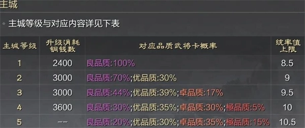 1、3级主城是前中期队伍强度的重要分水岭,升级3级主城的时机直接影响队伍成型的快慢。当主城达到3级时,优品质武将卡的刷新概率会大幅提升;主城4级时,卓品质武将卡的刷新概率上升;主城5级时,极品质武将卡的刷新率提高。也就是说,在解锁更高品质武将卡的同时,上一级品质武将卡的刷新率会有明显增长。