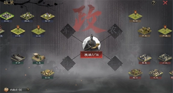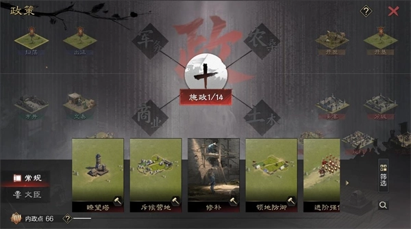 4、常规政策一旦实施便无法取消,而文臣政策实施后虽可取消,但消耗的2点内政点不会返还。因此施政前需谨慎考虑,避免无谓浪费内政点。前期可采用发育类政策,后期再切换为战斗类政策,以少量内政点的损耗换取前期的快速发展。