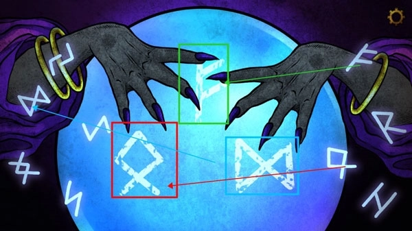 2、醒来时发现自己在柜子里,接着一直往右走,会遇到一位紫衣女人,和她对话后,把对应的符号移动到魔法球上