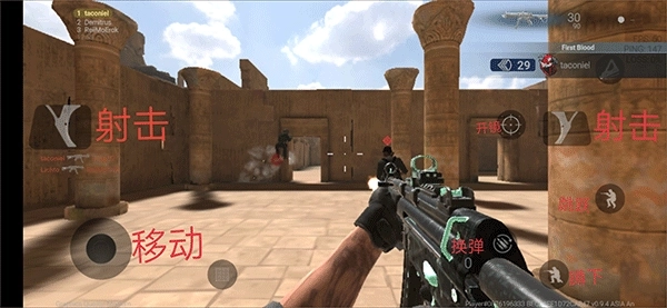 2、匹配成功后会直接进入游戏,接着可通过左下角的轮盘来操控角色移动,利用左右两边的扳机进行射击,同时借助换弹、蹲下、跳跃等按钮完成击杀敌人的操作。