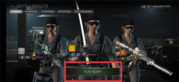 5、游戏结束后,你可以查看自己的战绩;要是还想和队友再玩一局,点击playagain就能继续。