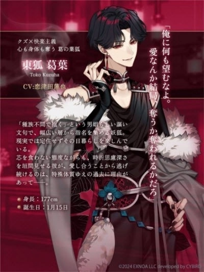 东狐葛叶(とうこくずは)的配音演员是恋津田莲也。他那温柔中又带着些许狡黠的声线,十分完美地展现了这个角色的特质。