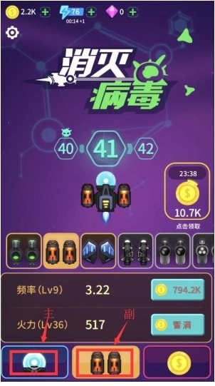 游戏界面下方最左侧的图标对应你的主武器,它有火力和射速两种属性,这两者需要优先升级。火力越强、射速越快,你的生存能力就越高,清除病毒的效果也会更出色。