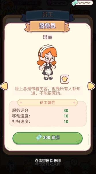 3、每位员工都具备独特的技能特质与性格设定,消耗金币就能完成聘用。