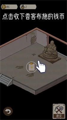 2、耐心等待香客进入天王殿内,当看到天王殿内部环境破烂不堪时,可点击【建设】按钮来对其进行修缮改善。