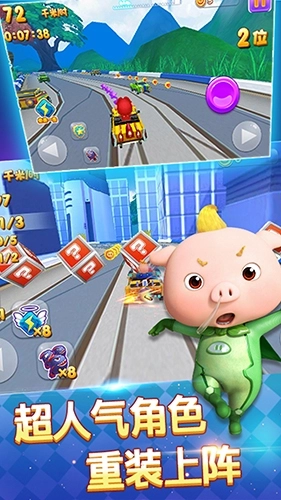 超人气动画角色集体变身——勇敢无畏的猪猪侠、呆萌可爱的小呆呆、气场全开如BOSS的超人强,驾驶着超酷炫的赛车在赛道上和对手展开激烈竞速!